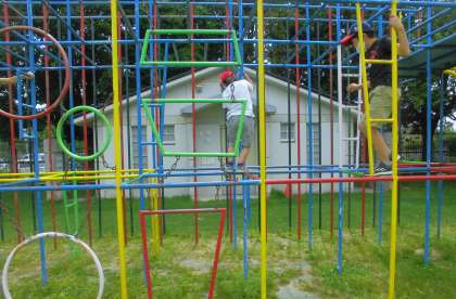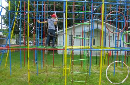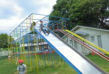 中間休みに総合遊具でお友だちと遊ぶ姿が見られました。上の方が少し苦手な人も友だちのさそいで,上っていました。三種類の滑り台を楽しんでいました。