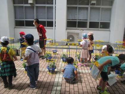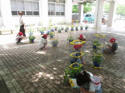 「ツルがまきついてる!」「まきついてないツルもある・・・まきつけとこう」と,子どもたちは自分のあさがおの様子を話しながら,観察していました。
