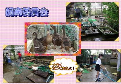 飼育委員会は毎日2〜3人ずつ,中間休みにアイガモやアヒルの世話をしています。えさ(野菜)や水をあげたり,掃除をしたりしています。