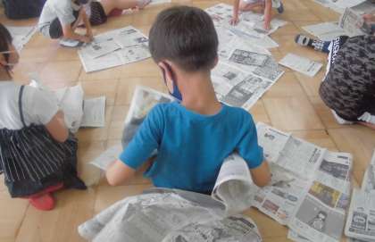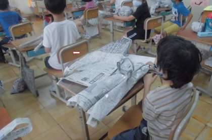 2年生は,図工で「しんぶんしとなかよし」の学習をしました。しんぶんしをまいたり,わっかをつくったり,まるめたりして楽しんでいました。全体の場で,どんなものをつくったのかの交流もしました。
