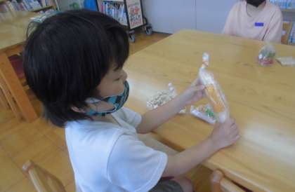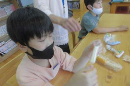 その後,大豆・とうもろこし・米やポップコーンのお菓子などいろいろな食べ物をなかまに分ける活動をしました。大豆ときなこが同じものだとは,気づかなかったようです。図書室の本には,食べ物に関する本もたくさんあります。食べ物の作り方がくわしくのっている本もあり,さっそく借りている人もいました。