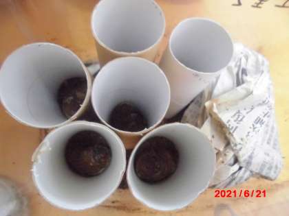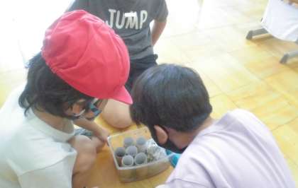 人工の蛹室(トイレットペーパーのしん)に移し替えたカブトムシのさなぎの様子を観察しました。元気かなと心配そうにのぞく子どもたち。少し動くと「うごいてる。」とうれしそうでした。成虫になって出てくるまで,毎日見守っていきます。