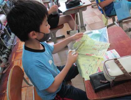 はさみと針を使うときの注意点をみんなで話し合ってから,裁ちばさみを使って練習布を切りました。次は玉止めと玉結びの練習をします。けがに気を付けて活動しましょう!