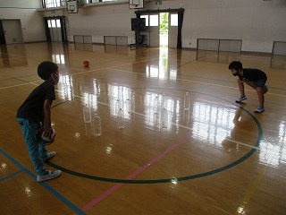 3くみの体育館での活動では,2Lのペットボトルをピンに見たててボーリング遊びをしました。初めに円の枠にピンを少し離して並べます。そして枠の外からピンを目がけてボールを転がします。遠くへ転がっていったボールは取りにいきます。4人でしたり,ペアでタイムを競ったりと楽しく行いました。つぎは,ペットボトルに少し水を入れてチャレンジです。