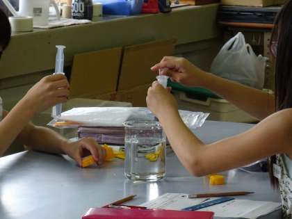 理科の学習では,閉じこめた空気や水に力を加えると,体積がどのようになるのかについて実験しました。今日は,水を試し,前回の空気の実験結果と比べながら,考察しました!