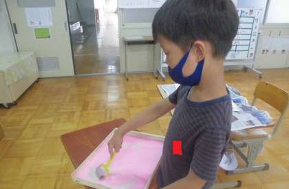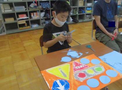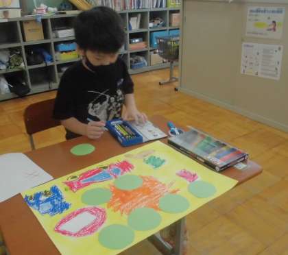 交通安全のポスターの絵が描けたので,背景を絵の具で色付けしたり,よびかけの言葉を考えたりしました。