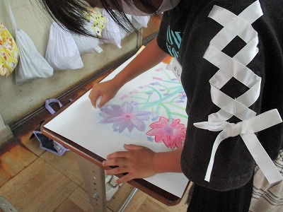 図工の学習でまぼろしの花を描いている4年生。今日は,まぼろしの花の完成を目指しました。子どもたちは,いろいろな道具を工夫して使いながら作り上げました。子どもたちが作り上げた作品はどれも素晴らしく,素敵な花ができました。