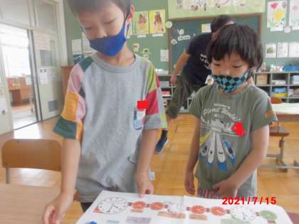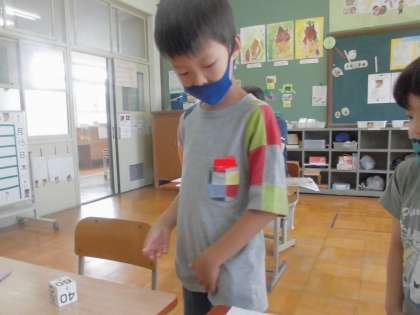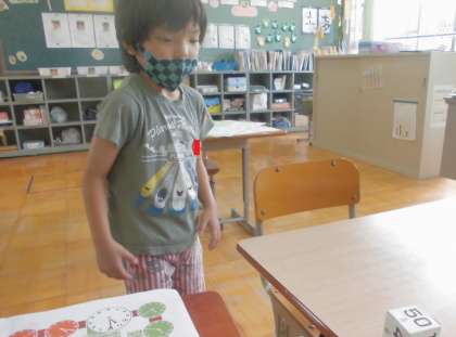 さいころも数字でなく,10分から60分になっています。10時がスタートで,3時がゴールです。40分すすむなどがあり,時計がよめないと少し難しいです。時計のマスをよみながら,楽しく取り組んでいました。