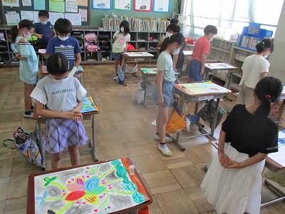 図工の学習で作り上げた「まぼろしの花」の鑑賞をしました。ロイロノートを使い,自分が工夫して描いたところや友達のいいところを出し合いました。子どもたちはとても集中して鑑賞することができました。