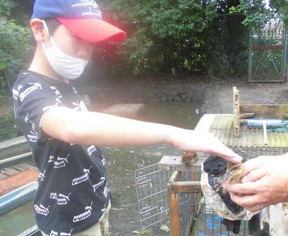 夏休み中にあいがものあかちゃんが3匹かえったので見に行きました。大人の手の中におさまるくらいの大きさです。小さいですが,足には水かきもつめもありました。指で頭をやさしくなでて,「かわいいな。」と言っていました。大きくなるのが楽しみですね。