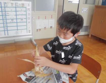 とうもろこしを一人一つずつもぎました。教室で皮をむき,皮のところをひもでくくって干す用意をしました。プレイルームに行くと,あらかじめ収穫していたとうもろこしがたくさんつるされていたので,「わぁ〜たくさん!」と喜んでいました。