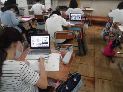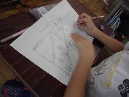 読んだお話から,想像したことを絵にしています。今は,アイデアスケッチをしています。どのような構図にするのかを考えて絵にしています。