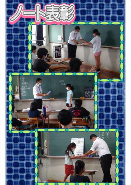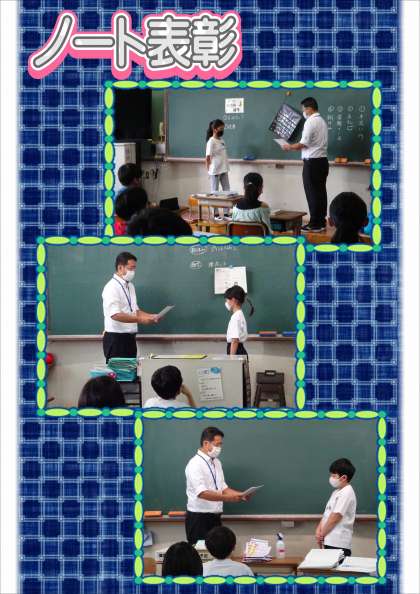 9月7日,朝の会の時間に校長先生が各クラスをまわって,ノート表彰をしました。選ばれたノートは里のホールに掲示して,みんなにも見てもらっています。