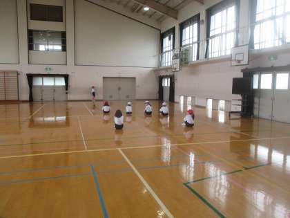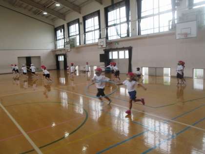 体育館では,色々な姿勢,進み方で「だるまさんがころんだ」をしたり,