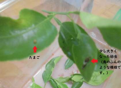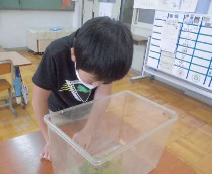 昨年度まで上里小学校におられた教職員の方からアゲハチョウの幼虫をもらいました。卵・卵からかえったばかりの小さい幼虫・少し大きくなった幼虫が6匹くらいいました。一人ずつ飼育ケースをのぞきこんで,幼虫を見ました。
