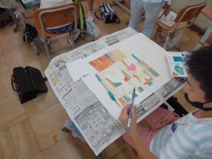 同じ物でも少しずつ色を変えてぬったり,グラデーションにしたりすることで,色鮮やかな作品になってきています。