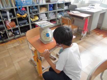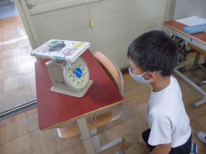 まず目もりの読み方を練習して,実際に自分の持ち物の重さをはかってみました。