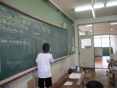 4年生は,算数の学習で「割合」をしています。子どもたちは,問題文を丁寧に読み,関係図やテープ図などで自らの考えを表現しています。全体交流の場では,図をもとに自分の意見を友達に分かりやすく説明することができました。