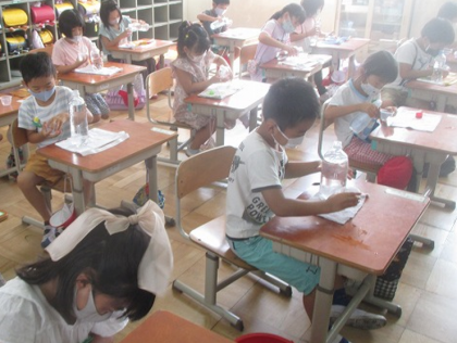 子どもたちは水をこぼさないようにしながら,真剣に比べていました。