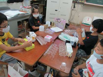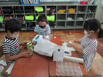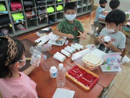 いろいろな材料を使って,どんな遊び道具が作れるかな?とみんなで相談しました。作ったおもちゃで,1年生に伝えたいことがあるようです。