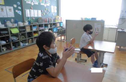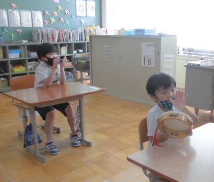 音楽の時間には,タンバリンやカスタネットをつかって,リズムうちをしています。音符やタン・タなどの音に合わせて,リズムを打ちました。初めは,「むずかしい。」と話していましたが,何度も繰り返すうちに上手に打てるようになりました。