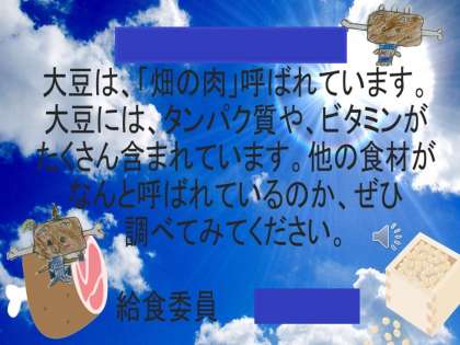 今日のクイズは,給食委員が作成した大豆についてのクイズでした。給食委員がデザインしたミールとニッキーも毎回登場しています。