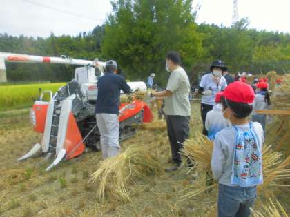 干してある稲穂を機械まで運び,脱穀してもらいました。