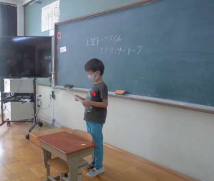 今日のトークタイムは「アナウンサートーク」でした。2年生,3年生と原稿が違ったので,何度か練習してみんなの前で発表しました。