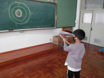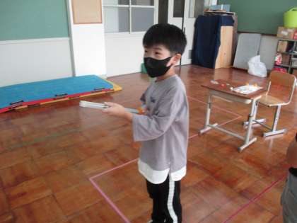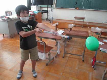 3組の3,4年生の理科の学習では,「空気でっぽう」を使って学習しています。遠くまで飛ばしたり,的をねらったりと,まずは,空気でっぽうでたくさん遊びました。「先生,こうしたら遠くにとぶよ」「こうしたらぜんぜんとばない」など,子どもたちのいろんな気づきがありました。