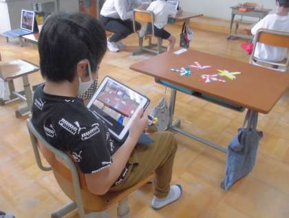 ストップモーションカメラを使ってコマ送りの動画を作りました。ぬいぐるみや折り紙のトンボ,身近にあるものを使い,少しずつ動かしてカメラで撮っていきます。