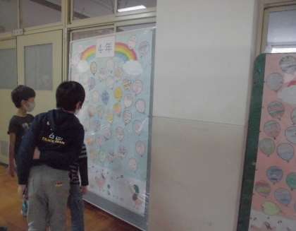 来週行われるバルーンリリースにむけて,全校の友だちのねがいや夢を見に行きました。3組の友だちの風船を見つけると,「あったよ。」と知らせてくれました。また,自分のねがいは,声に出して読んでくれました。