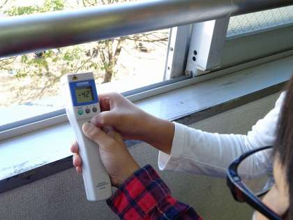 堀場製作所でつくられている「はかる」機械の一つ「放射温度計」を使わせていただきました。どんなに遠いところでも温度がはかれる温度計で,カイロや手のひらなどの温度はもちろん,今日は空の温度もはからせていただきました!