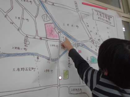 上里校区の略地図を見ながら,自分の家の近くにあるものを出し合いました。公園,パン屋さん,郵便局,ケーキ屋さんなどがあると伝えてくれました。