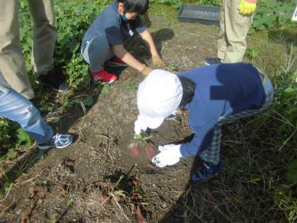 今日は,3くみの畑のいもほりをしました。掘り始めると,すぐにさつまいもの先が見えてきたので,周りを手でていねいに掘っていました。スコップで周りの土をほぐして掘り進めると,おいもがぞろぞろと出てきました。大きなおいもだったので,とても喜んでいました。
