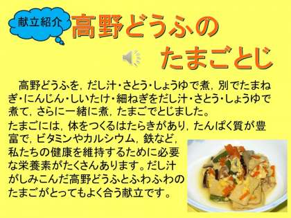 献立紹介では,高野豆腐の卵とじの作り方や卵の栄養について紹介されました。