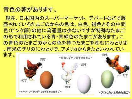 また,卵には,白,褐色,中間色のピンク以外にも青,青緑などがあることも紹介されました。青の卵は見たことがないので,スーパーなどで少し探してみたくなりました。