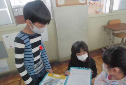 来週は初めての秋の遠足です。1年生とグループ活動をするので,場所やウォークラリーについてグループで確認し合いました。