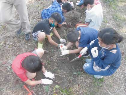 11月2日(火)の5・6校時に芋掘りをしました。春にさつま芋の苗を植えて,水やりや雑草抜きなどみんなでお世話をしてきました。どれくらいできているのか,どんな大きさの芋ができているのかみんなワクワクしながら掘っていました。