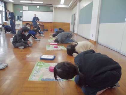 また,「心肺蘇生法」の方法も学びました。なかなか上手にはできませんが,方法を知っているだけで,命を助ける手伝いができるはずです!