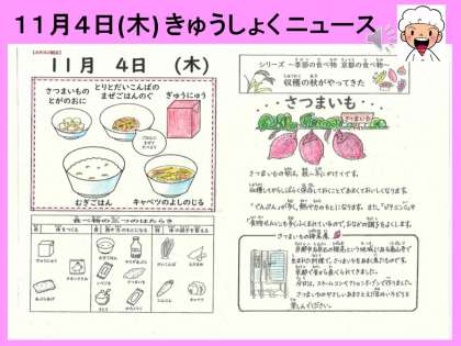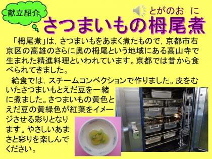 今日は,さつまいもの栂尾煮についての紹介がありました。栂尾の高山寺で昔から作られている精進料理で,ほのかにあまく,彩りもきれいです。