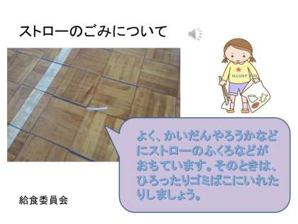 給食委員会からのお知らせでは,ストローのゴミについて配信されました。廊下や階段にストローのゴミを落とさないことはもちろんですが,落ちていたら拾うというマナーも守っていけば,なお一層よい上里小学校になりますね。
