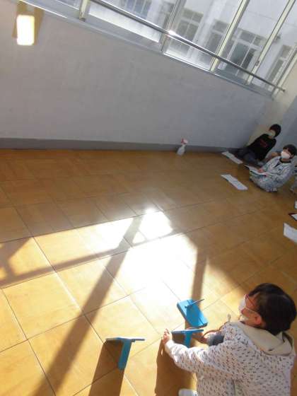 かがみ0まいでは,暗くて少し冷たかったのですが,かがみを増やして日光を重ねるたびに明るくなり,温度も上がっていきました。