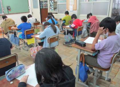 家庭科のテストに取り組みました。調理実習で取り組んだことを思い出しながら答えることができました。