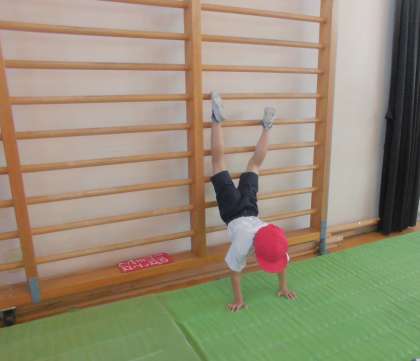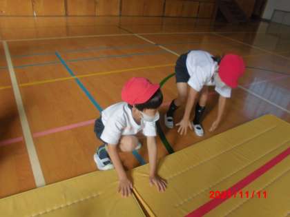 2年生は,体育でマットあそびをしました。1年生の時にやっていた体ならしを2年生でもやっています。1年生の時より,かえるの足うちは,足の位置が高く上がったり,ゆりかごでは,起き上がるスピードが上がったりしていました。