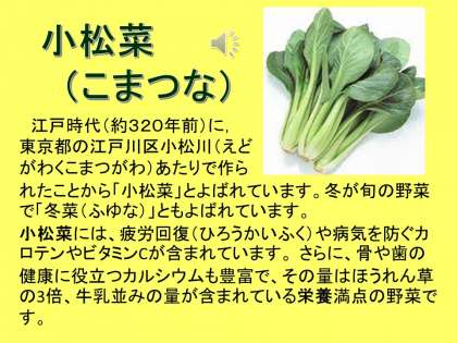 栄養満点の野菜「小松菜」についての食品紹介がありました。