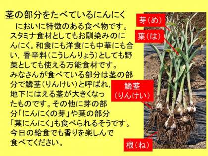 にんにくについてのクイズもありました。よく食べるにんにくですが,どこの部分を食べているのかを考えるきっかけになりました。