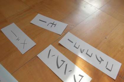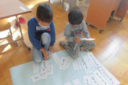 2年生は,カタカナのことばの仲間分けをしました。前の時間に書いたカードを並べて,同じ仲間に分け,なんの仲間か考えました。「どうぶつの(なき)こえ」「がいこくの人の名前」「外国の国やまち」など,分けた言葉を大きい模造紙に貼りました。