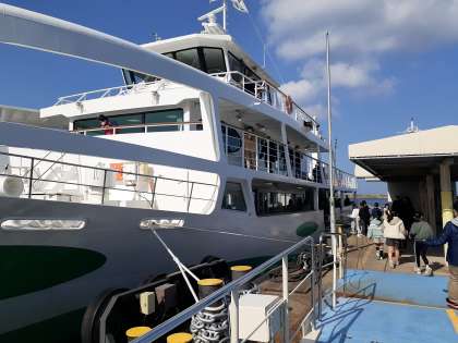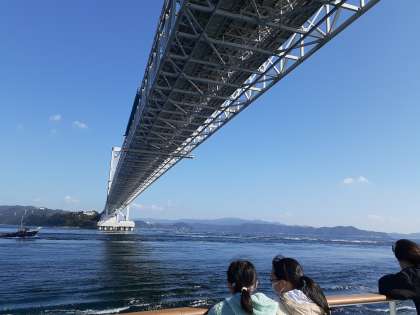 震災記念館を出て,大鳴門橋を渡り,徳島県へ。亀浦港から船に乗り,うず潮を見学しました。頭の上には,通ってきたばかりの大鳴門橋が見えます。