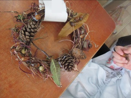 アサガオで作ったリースに飾り付けをしました。