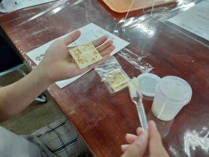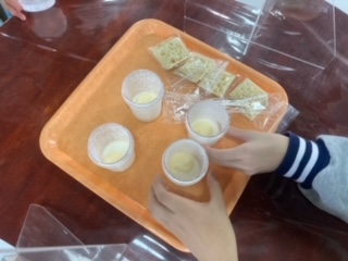 淡路島牧場でバター作りの体験をしました。乳脂肪分の多い生クリームを容器に入れ,激しく振り続けると,だんだん固形分が出てきます。これをラップの上にのせて,ヘラでつぶし,水分を押し出すと出来上がりです。